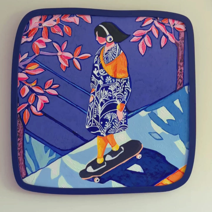 She’s in her own world—skating through clouds of bold blues and soft pinks, headphones on, heart tuned to her rhythm. Glide & Groove captures that sweet, fleeting harmony between movement and stillness. There’s freedom in her ride, calm in her flow, and just the right amount of wobble to keep it real (because what’s life without a little imbalance? ). It’s a quiet celebration of presence—of surrendering to the moment and letting it carry you.