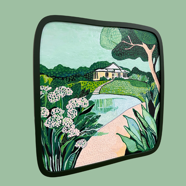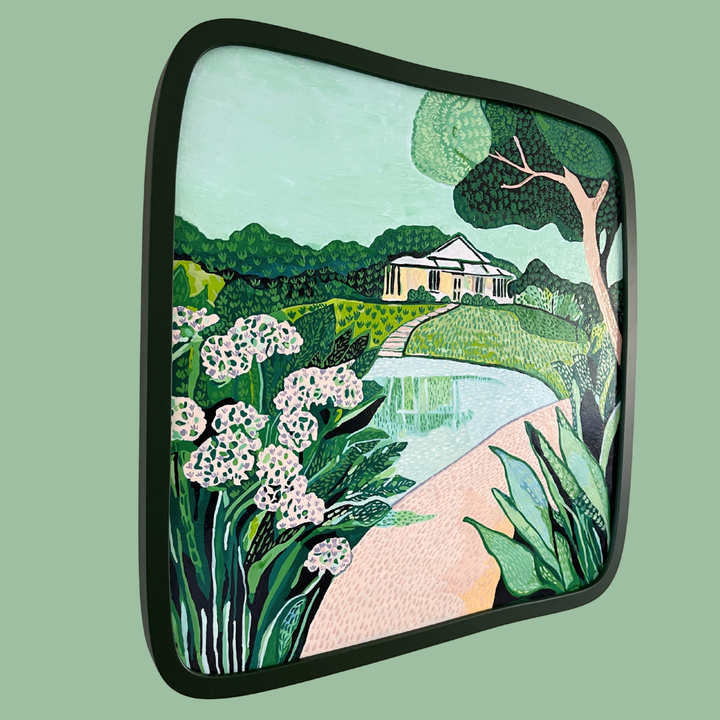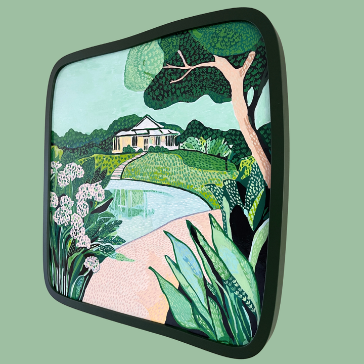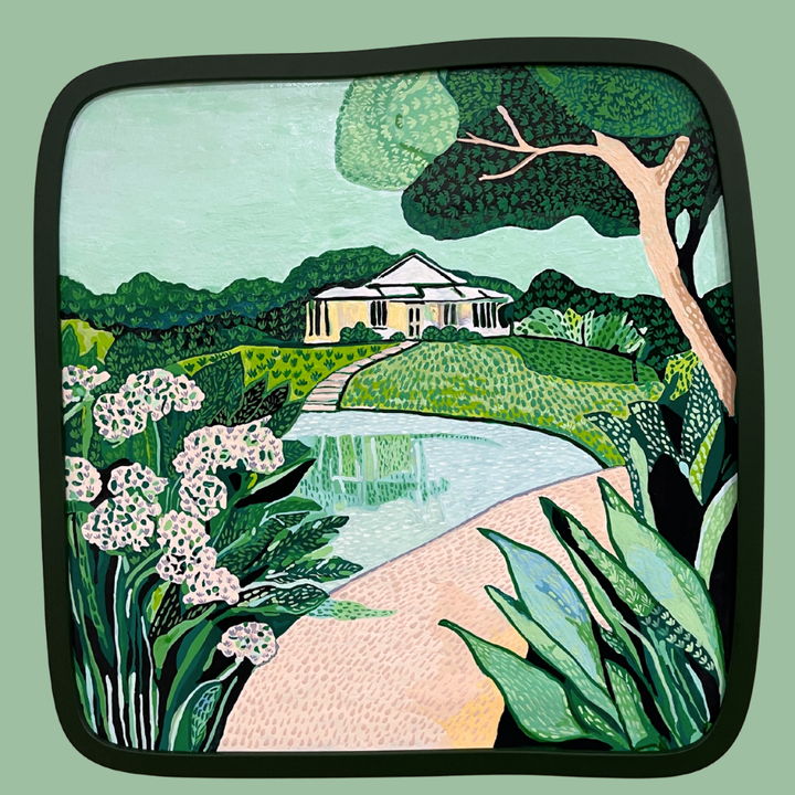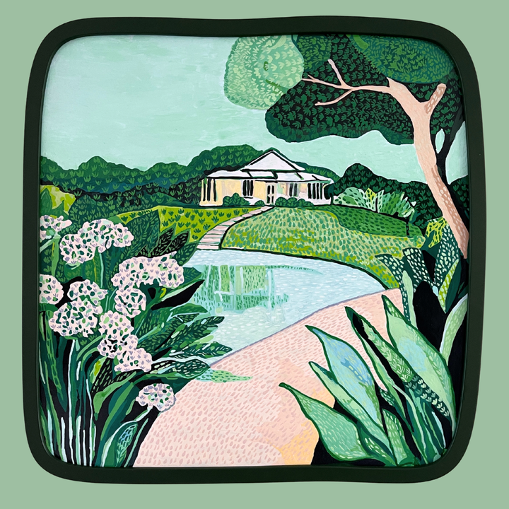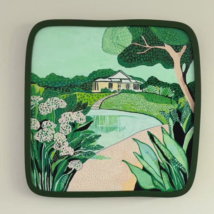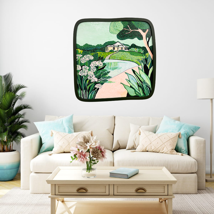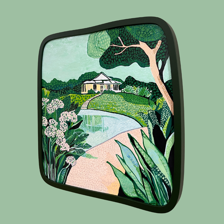 Lakehouse is a playful exploration of imagination and memory—where a staircase leads to nowhere, a winding path disappears into mystery, and a pohutukawa tree stands watch with quiet intrigue. Infused with subtle Madhubani folk influences and wrapped in rich, layered shades of green, this work balances structure and spontaneity with a dreamlike twist.