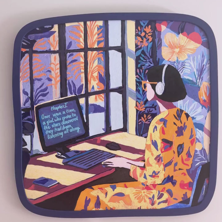 Rendered in rich acrylics and framed in Wallace Studio’s distinctive Shakey Square, this piece is a heartfelt ode to introspection, imagination, and the quiet symphony of writing life.