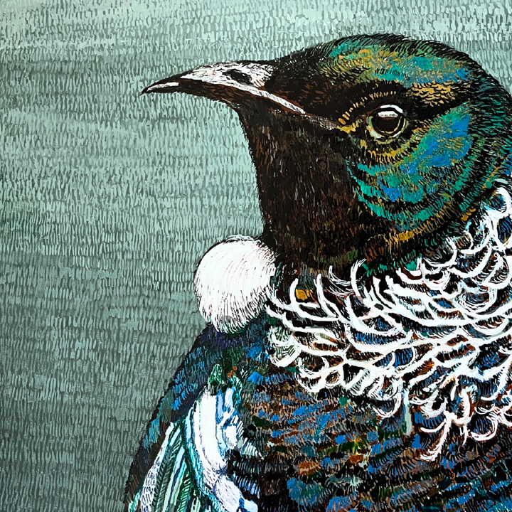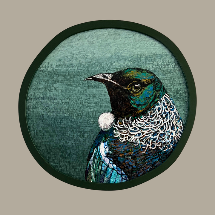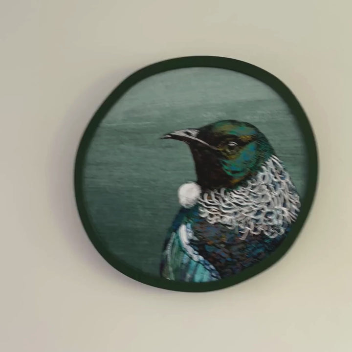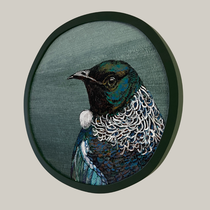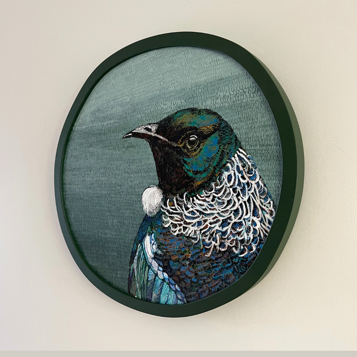 Playful, vibrant, and full of secret charm—Whispers of the Tūī captures the spirit of one of Aotearoa’s most iconic native birds. Set in a lush monochrome palette of greens, this circular acrylic piece invites you into the quiet mischief of the forest canopy.